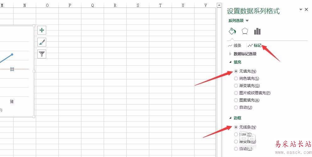 5、同樣數(shù)據(jù)標(biāo)記點設(shè)置填充顏色和線條顏色均為無,如下圖所示: