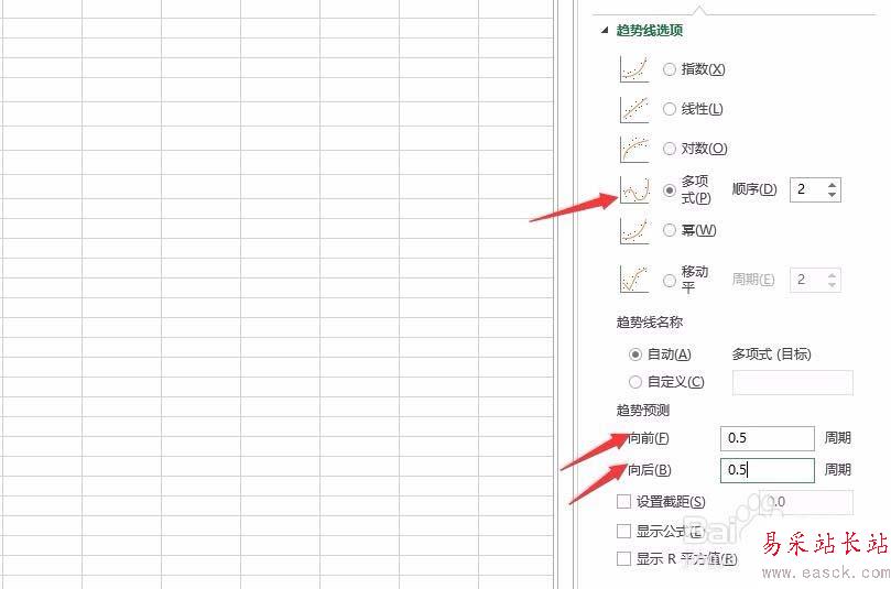 3、右鍵點擊趨勢線,選擇 設(shè)置趨勢線格式 ,在右側(cè)趨勢線選項中選擇 多項式,趨勢預(yù)測中向前向后各設(shè)置為0.5,如下圖所示: