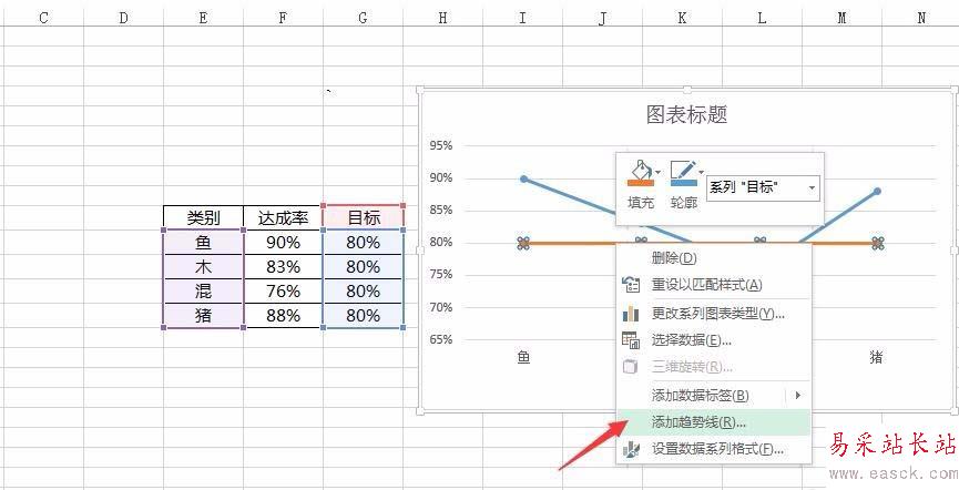 2、右鍵點擊目標(biāo)折線,選擇 添加趨勢線 ,如下圖所示: