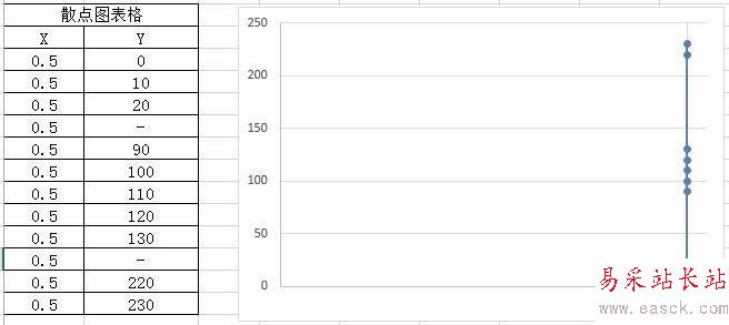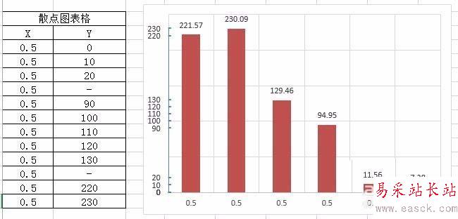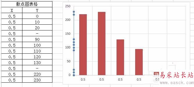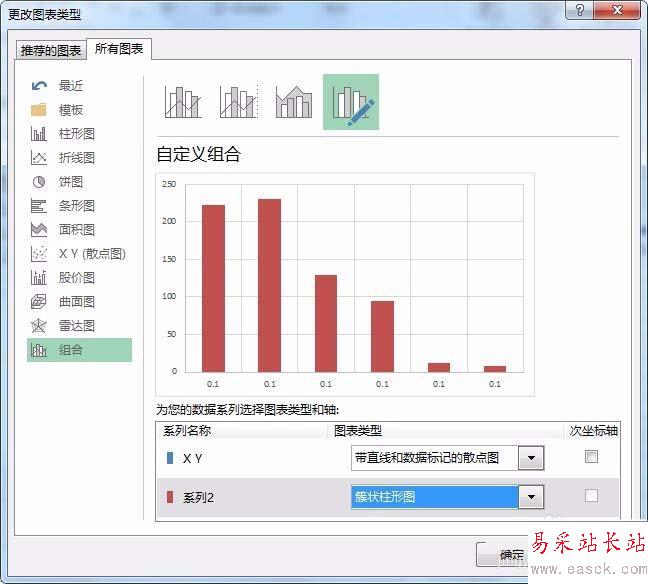但新數據在散點圖中是以散點圖形式存在的,點擊散點圖>右鍵>更改系列圖表類型(Y),打開“更改圖表類型”對話框,將系列2的圖表類型改為“簇狀柱形圖”,點擊確定,可以得到散點位于坐標軸位置的柱狀圖。