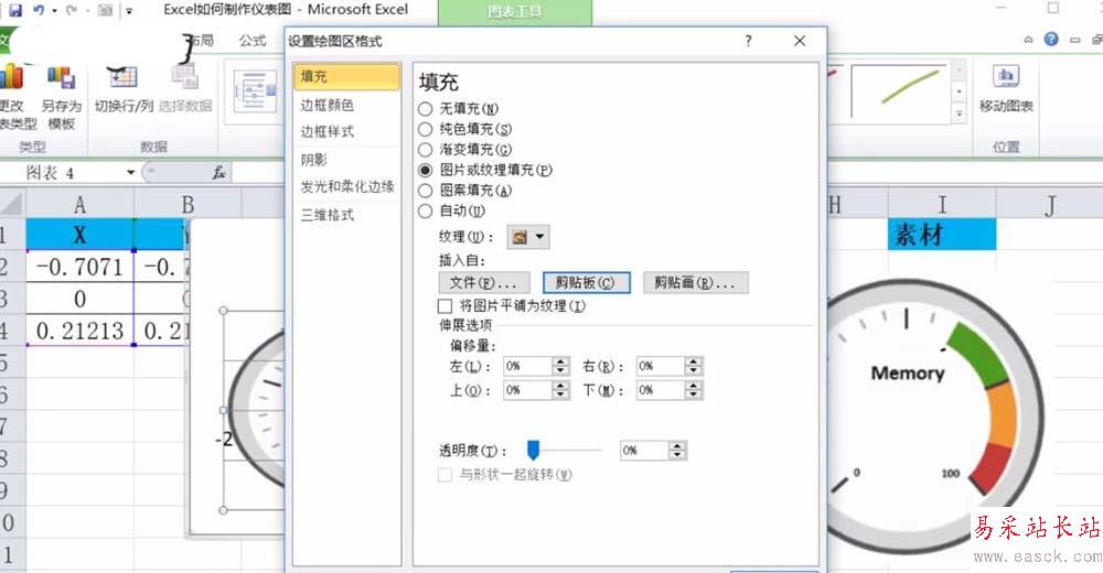 3、接著復制儀表圖的素材,雙擊圖表繪圖區,調出對話框,選擇“圖片或紋理填充”,點擊“剪切板”,最后點擊“關閉”即可。
