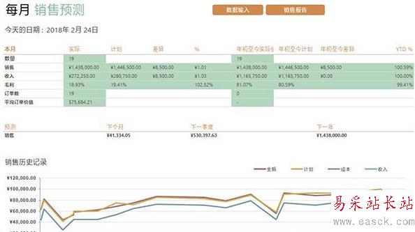 這是一套月度銷售額預測報表,內含數據輸入、銷售報告、銷售預測三大標簽,已經算是很完整的一套月報檔案了。