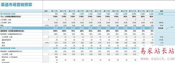 這是一套很不錯的模板,按照預期銷售額,人力資源成本、直營成本、電話營銷成本、網絡營銷成本等進行劃分,所有數據按1-12月并行排列,同時還有圖表做為參考,能夠省去很多繁雜的工作。