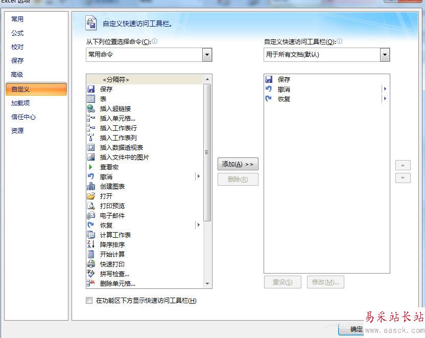 4、彈出Excel選項窗口,在窗口自定義處,還有一大推excel的快捷命令