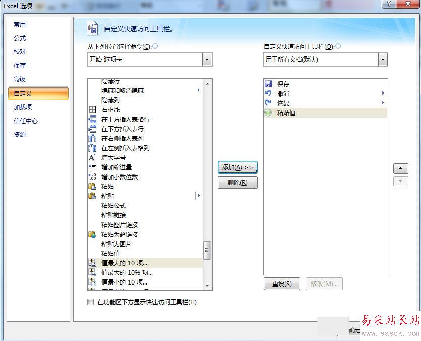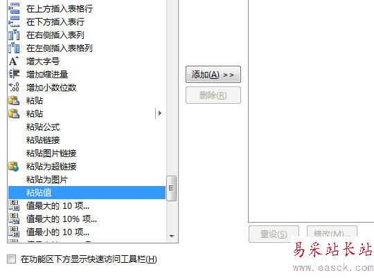 把EXCEL選擇性粘貼數值設置在自定義快速訪問工具欄