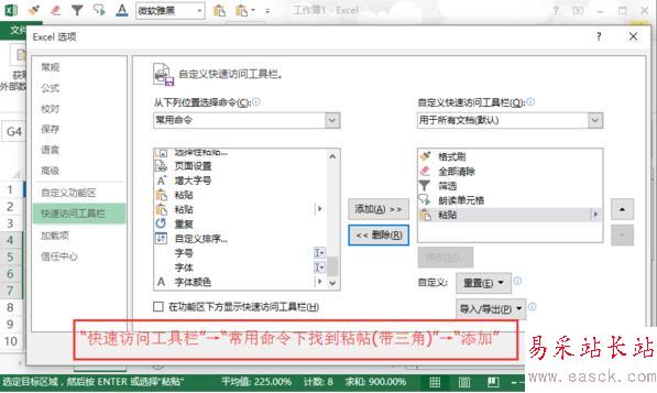 2、“快速訪問工具欄”→“常用命令下找到粘帖(帶三角)”→“添加”