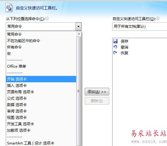 5、在選擇命令處,下拉選擇“開始選項卡”