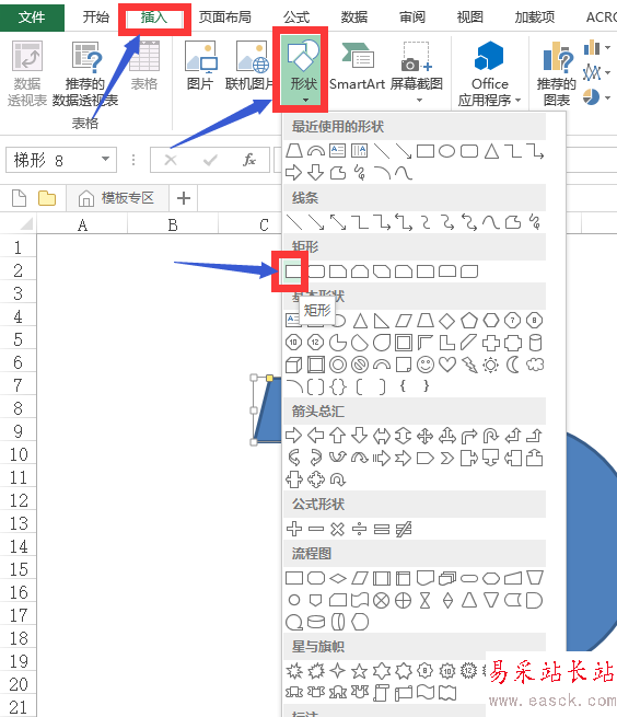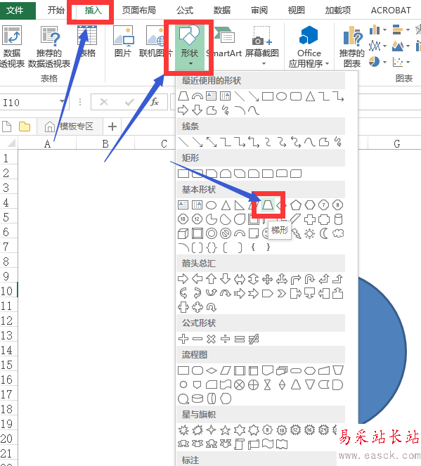 1、繪制輪齒,具體操作:點(diǎn)擊菜單欄“插入”—“形狀”,選擇梯形形狀。