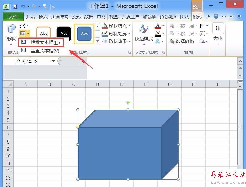 4、選擇剛剛繪制的長方體在格式里找到繪制橫排文本框選項,如圖所示: