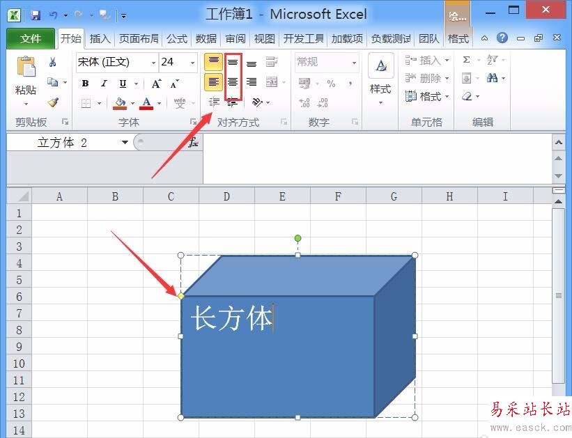 6、選擇橫排文本框選項,我們在剛剛繪制的長方體上單擊鼠標作左鍵然后輸入文字,輸入文字之后我們在開始里找到垂直居中和居中選項,如圖所示: