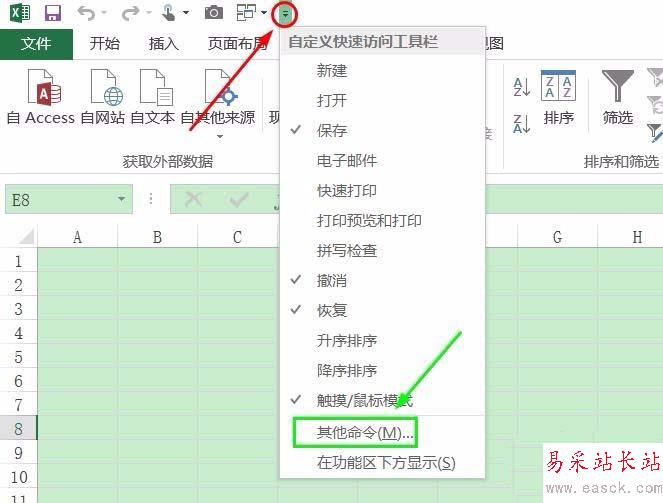 1、首先打開Excel選項的入口就不一樣了,Excel2013我們只需要點(diǎn)擊最上方的三角形下拉按鈕,然后在彈出的窗口里找到"其他命令"即可,如圖;