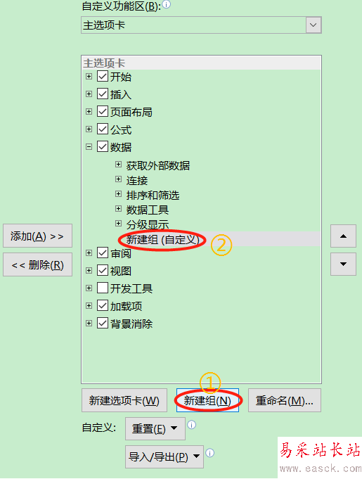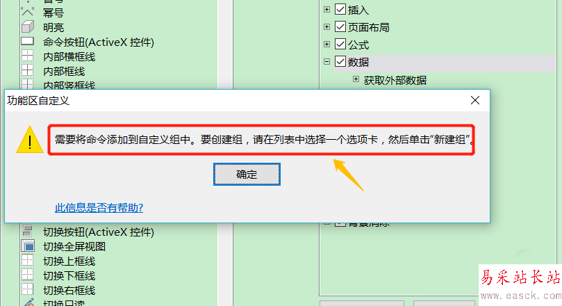 3、不過接下來就又會有區(qū)別了,以前的Excel我們找到其他控件以后直接添加就可以,不過Excel2013就不能了,我們首先需要在右側(cè)的自定義功能區(qū)中"新建組"才可以,接著其他控件添加進(jìn)去,后面的操作就都一樣了,小編不再贅述;