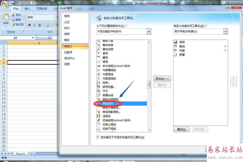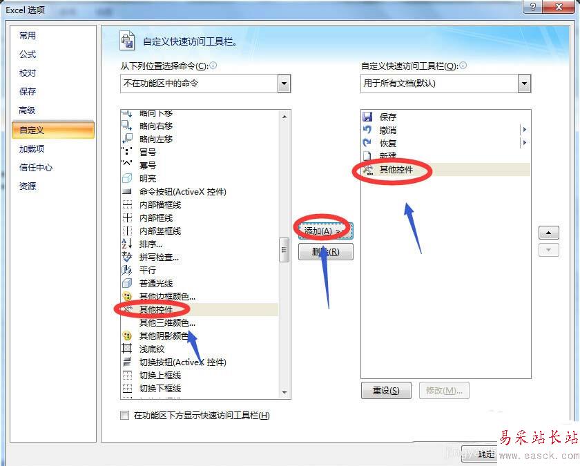 2、接著在彈出的”EXCEL選項“對話框最左側(cè)選擇”自定義“,然后將常用命令改為下拉菜單中的”不在功能區(qū)中的命令“,然后在此命令下找到”其他控件“,之后選擇”添加“