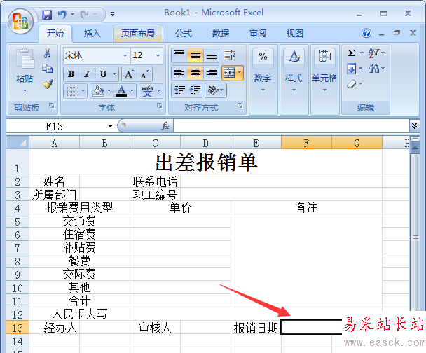 9、在下面的一行上輸入經(jīng)辦人、審核人、報銷日期,最后將【F13、G13】合并為一個單元格,表格的基本制作完成了。
