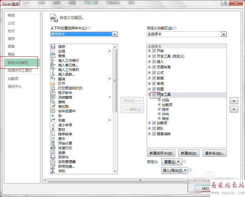 1.在開發工具里面,如果你沒有找到開發工具選項卡,點擊左上角的"excel圖標"-->選項,在“常用”標簽頁里面,找到“自定義功能區”-->主選項卡-->在“開發工具”前面打勾就可以;