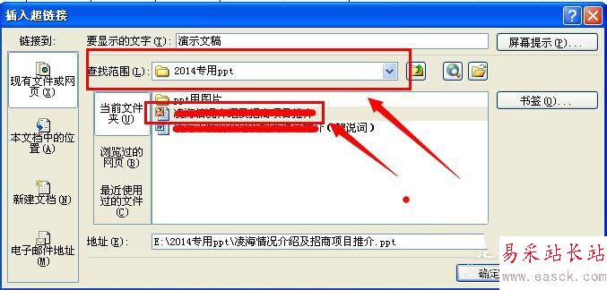 4、然后就彈出選擇超鏈接文件對話框,我們仔細(xì)查找我們需要插入的演示文稿文件。然后點(diǎn)擊確定。這個時候基本插入成功。雖然簡單卻很實(shí)用。