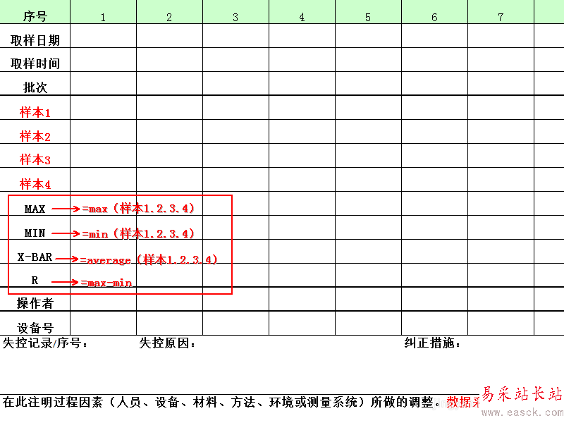 表頭主要是涵蓋以下詳細信息,即類別、部門、工序、控制項目、工程規范、樣本容量和頻次,其中控制項目即為百度經驗瀏覽量,這是整個Xbar-R控制圖制作過程的核心,工程規范為某個時間要求經驗瀏覽量范圍(310-380)次。