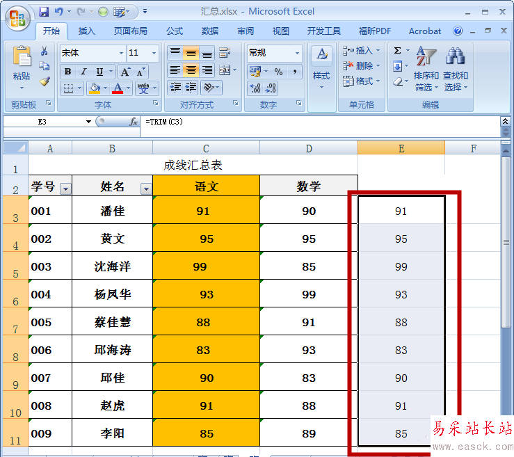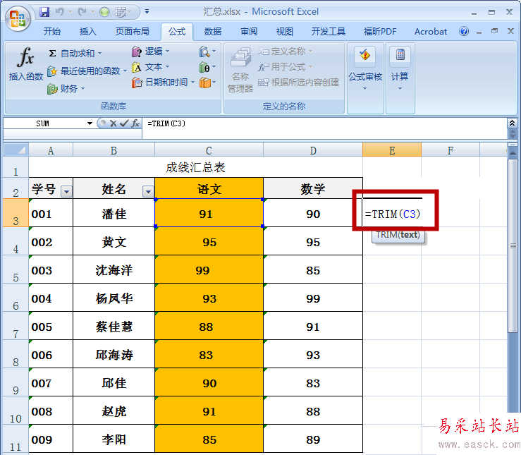 2、我們?cè)谳斎霐?shù)據(jù)時(shí),最常犯的錯(cuò)誤是多輸入空格,但空格是看不見(jiàn)的,這對(duì)排序結(jié)果是有影響的。怎么辦呢?我們只要用trim公式去掉空格就好了。在E3單元格輸入公式“=TRIM(C3)”。