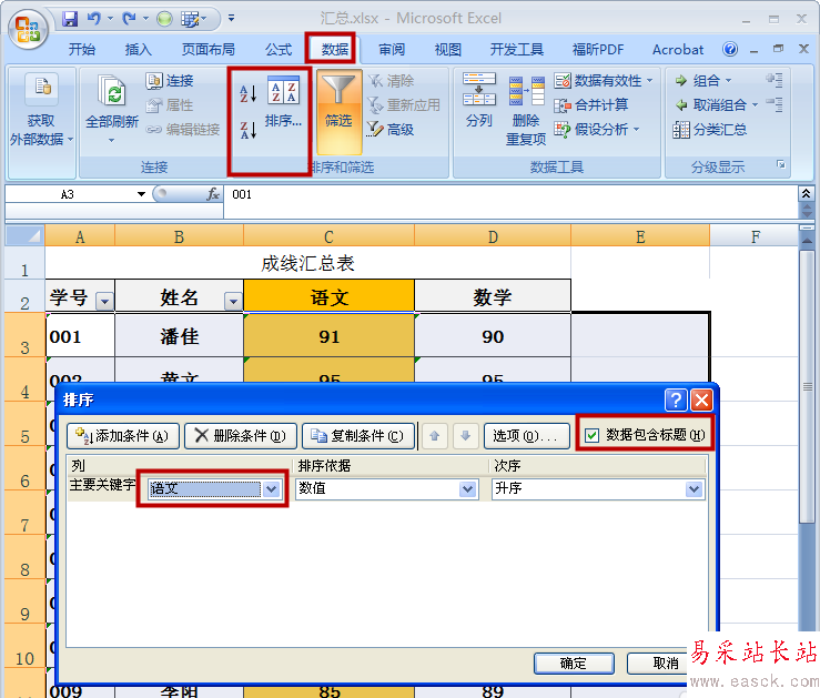 9、下面開(kāi)始排序,選中需排序的內(nèi)容,點(diǎn)擊菜單”數(shù)據(jù)“下的”排序“按鈕。彈出”排序“對(duì)話框,設(shè)立”主要關(guān)鍵字。勾選“數(shù)據(jù)包含標(biāo)題”。