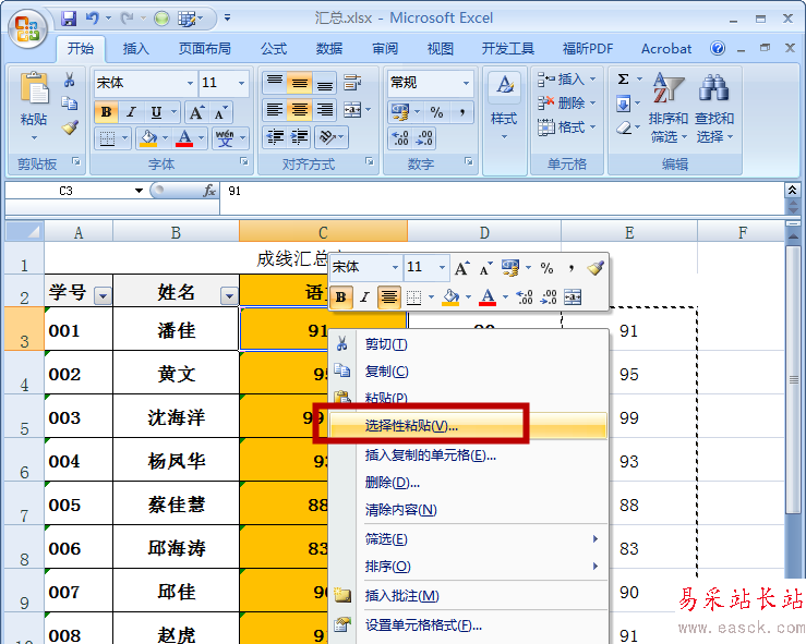 6、鼠標(biāo)右擊C3單元格,彈出對(duì)話框,選擇“選擇性粘貼”。