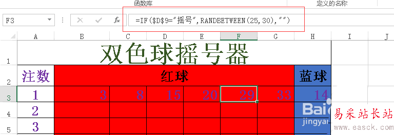 3、 然后在表格中寫上公式。 B3公式 =IF($D$9="搖號",RANDBETWEEN(1,6),"")