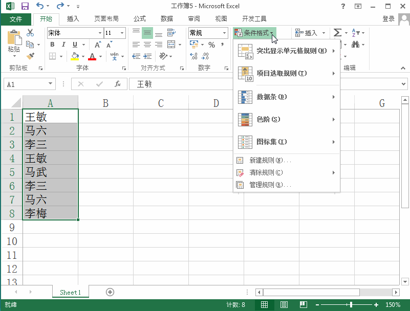 1、首先打開我們的excel表格文件,選擇需要提取的列,然后在開始里找到條件格式選項,如圖所示: