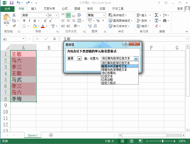 3、在重復值對話框內設置紅色文本選項,然后點擊確定,可以看到效果如圖所示: