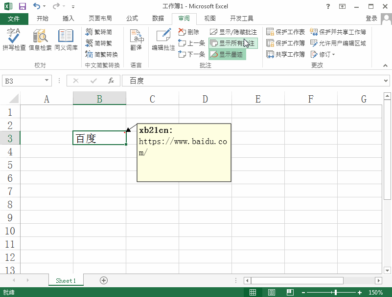4、添加好批注之后,我們在上面的編輯區域里找到顯示/隱藏批注選項,可以看到我們的批注就顯示出來了,如圖所示:
