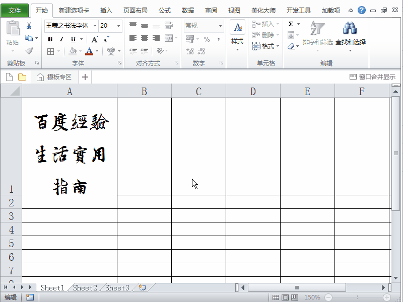 4、接著在單元格中輸入文字內容,并設置字體為王羲之書法字體,字號為20,設置居中對齊。