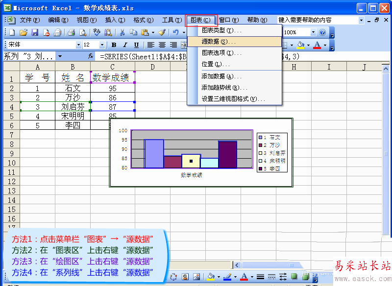 2、選定需要操作的圖表,點擊菜單欄啊“圖表”→“源數據”