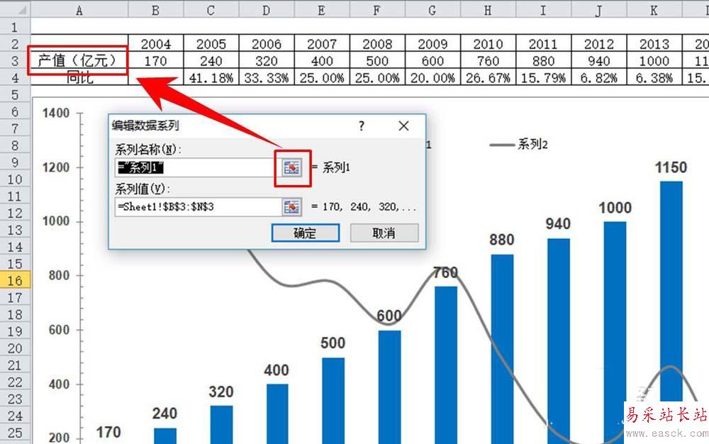 4、這時,又會彈出一個“編輯數據系列”的窗口,點擊圖示位置的圖形,然后選中含有圖例所代表文字的單元格。