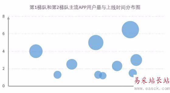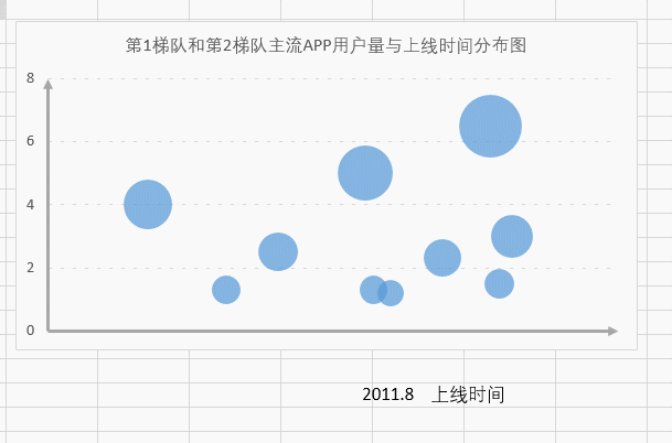 3、圖表設置:自動生成的圖表,把橫軸和縱軸的位置是相反的,同時代表氣泡面積的數據也默認為同一個數值。在X軸系列值選擇上線時間列數據,Y軸系列值選擇用戶量列數據,系列氣泡大小同樣選擇用戶量列數據。