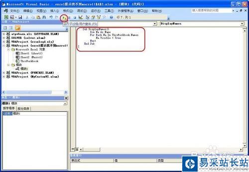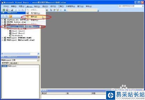 2、在Excel界面上按Alt+F11,進入VBE窗口,在左邊“工程”窗口中點選出問題的那個工作簿,然后插入一個模塊