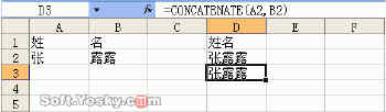 除了這種方法外,我們也可以使用函數達到同樣的目的。選中D3單元格,輸入公式“=CONCATENATE(A2,B2)”,回車后得到的結果和前面的公式是一致的(圖 6)。