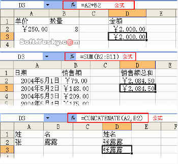 比如下圖所示的三個公式功能舉例:第一個公式自動計算出單價與數量的乘積得到金額,第二個公式自動計算所有銷售額的和,第三個公式將姓和名合并在一起得到全名。