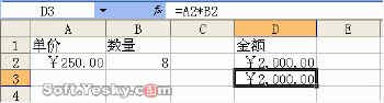 下圖所示的工作表中的A2和B2單元格分別存放著某種商品的“單價”和“數量”數值,為了計算“金額”數值,可以在D2單元格中輸入公式“=250*8”(圖 1),通過后面的學習我們會知道,像這樣使用具體數值建立的公式,適應性很差,因此用得也很少。