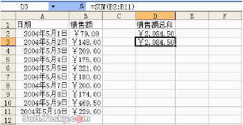 選中D3單元格,輸入公式“=SUM(B2:B11)”,可以看到得出的計算結果是一樣的(圖 4),其中SUM為Excel的內置函數,功能為求出各項數值之和。