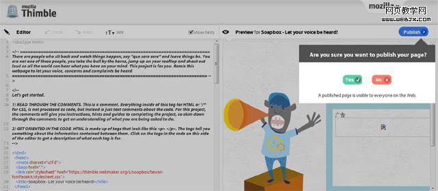 Thimble 提供的是雙面板設計,左側為帶語法高亮的代碼編輯,右側可實時預覽網頁效果,如果用戶對效果滿意,可通過右上方的藍色 “Publish” 按鈕一鍵發布,還可通過提供的Twitter 發布按鈕與好友分享你的設計成果。