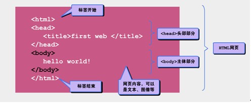 通過上圖可以看出,所有內容都在<html></html>標簽之內;<head></head>內放的是頭部信息,對頁面的描述,該內容不會顯示在頁面中。<title></title>中設置的是頁面的標題,<title>只能放到<head>中;<body></body>是頁面的主體,該標簽內的文本會在網頁上顯示。當然所有頁面至少應包含這些部分。