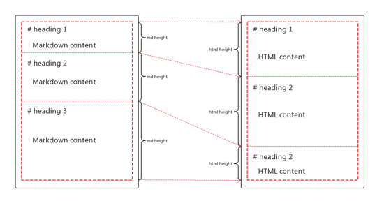 getCurrentHeading() 獲取。 headingInfo.height 的比值計(jì)算出的數(shù)值再加上 headingInfo.offsetTop 的值就是預(yù)覽區(qū)的 scrollTop 。同步問(wèn)題
