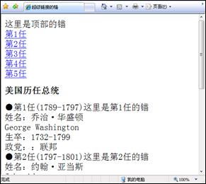 在測試之前,讀者從代碼4.20可以看到,定義錨也是用的<a></a>標簽,錨的名稱用name屬性定義(名稱沒有限制,可自定義)。而尋找錨的鏈接用href屬性指定對應的名稱,在名稱前面要加個#符號。在瀏覽器地址欄輸入http://localhost/a_anchor.htm,瀏覽效果如圖4.21所示。