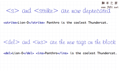 在昔日,<S>和<strike>允許用來定義網站文字。不過,現在他們被定義為不推薦使用的標簽,當他們任然可以有效 果.現在用新的標記集- <del>和<ins>。來替換<s><strike>