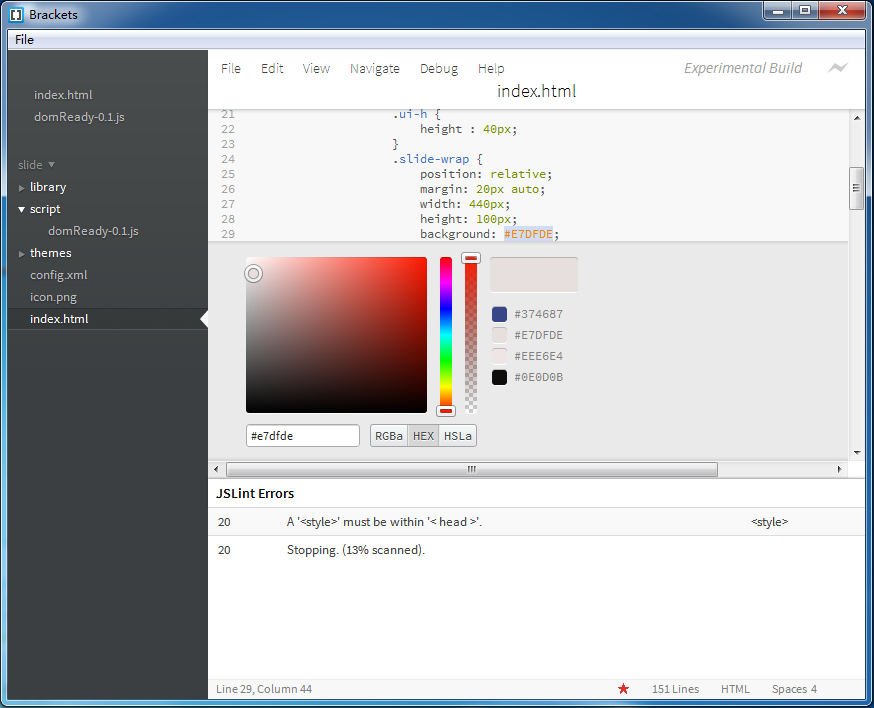 4、Brackets內建取色器,提供RGBa、HEX、HSLa的顏色編碼形式。把光標放在一個顏色編碼上,按下Ctrl/Cmd + E(“編輯”),退出取色器窗口需要使用Esc鍵。