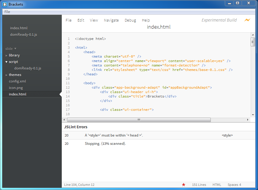 1、打開Brackets,整個界面很簡潔,頂部菜單欄只提供file > exit退出編輯器功能。左側為項目組織結構的文件樹,使用Ctrl/Cmd+Shift+H可以呼出與關閉文件樹。右側為編輯區,上部為工具欄,中部為文檔區域,下部為提示區域。