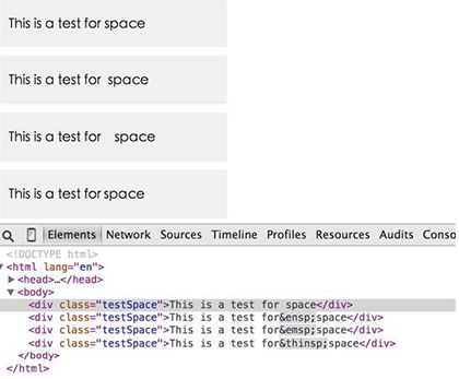 以下是 Unicode 中有 HTML 實體形式的空格及其產生的空白的效果: