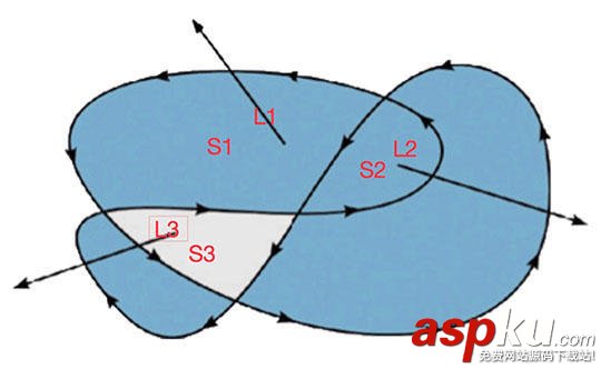 S3中引出的射線L3,與兩條子路徑相交,但是其中有一條的反方向,計數器+1-1,結果為0,在里面。沒錯,只要結果不為0,該射線所在的區域就在外面。