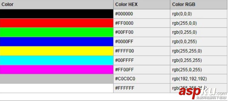 僅僅有 16 種顏色名被 W3C 的 HTML4.0 標(biāo)準(zhǔn)所支持。它們是:aqua(淺綠色), black(黑色), blue(藍(lán)色), fuchsia(紫紅色), gray(灰色), green(綠色), lime(綠黃色), maroon(褐紅色), navy(深藍(lán)色), olive(橄欖色), purple(紫色), red(紅色), silver(銀色), teal(青色), white(白色), yellow(黃色)。如果需要使用其它的顏色,需要使用十六進(jìn)制的顏色值。
