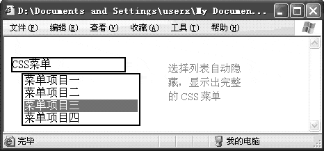 頁面的<STYLE>部分定義了三個樣式,分別用于菜單條、菜單項目、選擇列表,通過樣式定義保證菜單、選擇列表的顯示區域重疊。<BODY>部分包含菜單和<SELECT>選擇列表的定義。當鼠標經過菜單條時,JavaScript函數showMenu執行,顯示出菜單,同時隱藏SELECT選擇列表。鼠標離開后,hideMnu函數隱藏菜單,同時恢復選擇列表。其余幾個JavaScript函數主要用于模擬菜單動作,鼠標經過菜單項時以高亮度顯示菜單(setStyle函數),鼠標離開菜單項目時則將它恢復默認顯示形式(setDefault函數)。頁面的運行效果如圖二所示。將showMenu函數中的document.getElementById("lb_1").style.visibility="hidden"語句注釋掉就可以看到圖一的效果。