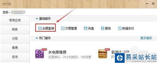 5、點擊打開支付寶對話框,在支付寶的基礎服務里,我們點擊余額查詢,如下圖所示。