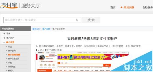 5、解決上述問題的辦法確實是要找客服,由客服幫忙開通“解綁入口”。打開客服的正確方式是:在支付寶首頁右上角點擊“服務大廳”,在“常見問題”下的“賬戶信息管理”中找到如下這條問題的解答,在最下面點擊“淘寶在線客服”,就能找到解決問題的客服了